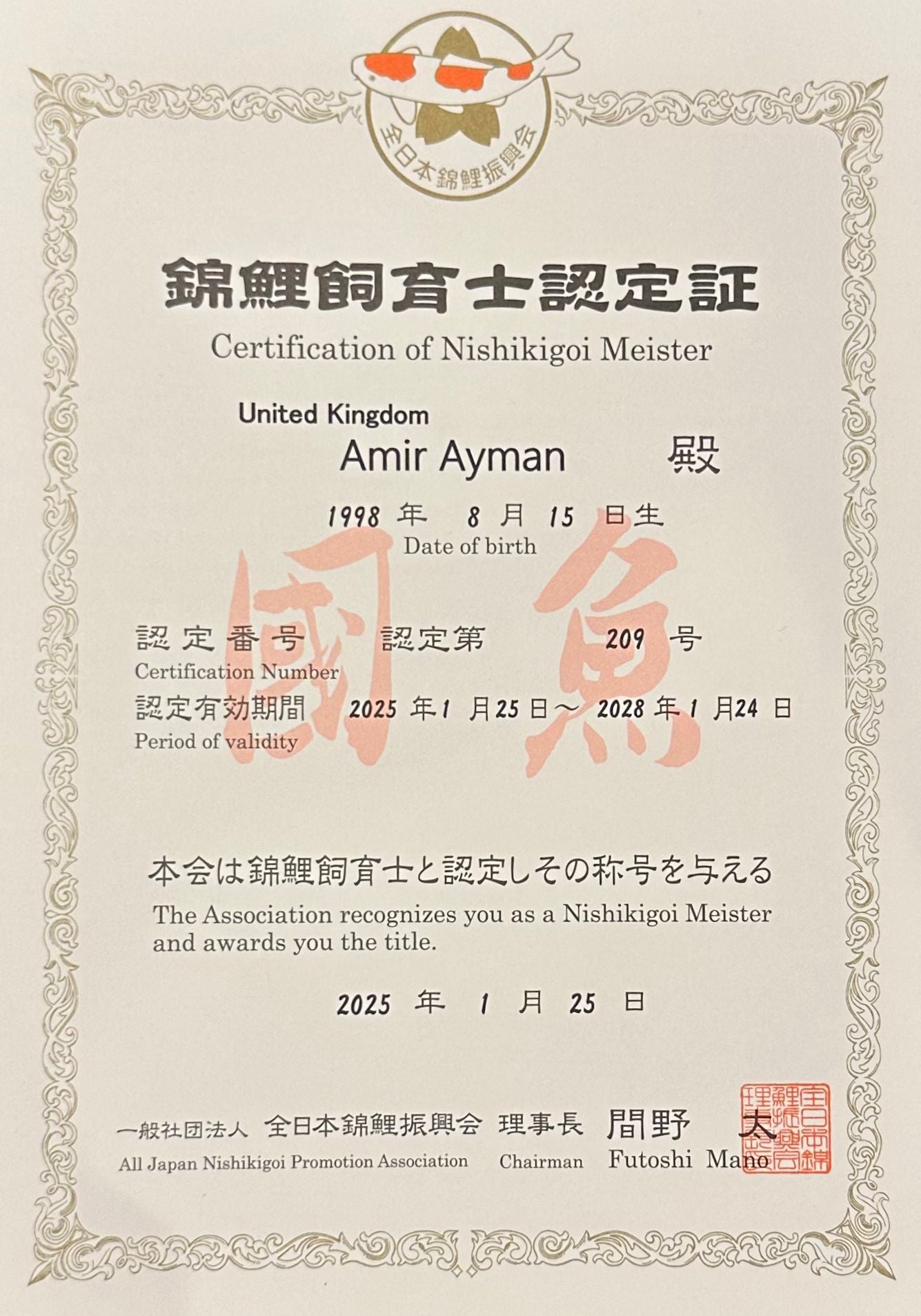 Amir Ayman took over the management of Koi Water Barn in 2022, bringing with him many years of experience in the aquatic trade, including pond construction, koi importation, and specialist fish handling, supported by a BSc in Animal Management. Today, he travels regularly to Japan to hand-select exceptional koi for our customers and is recognised as one of the only Shinkokai-certified Koi Maestros in the UK.